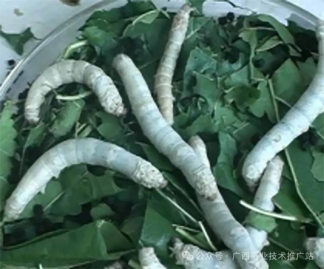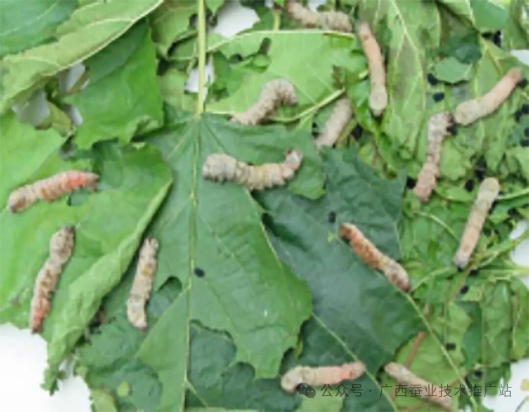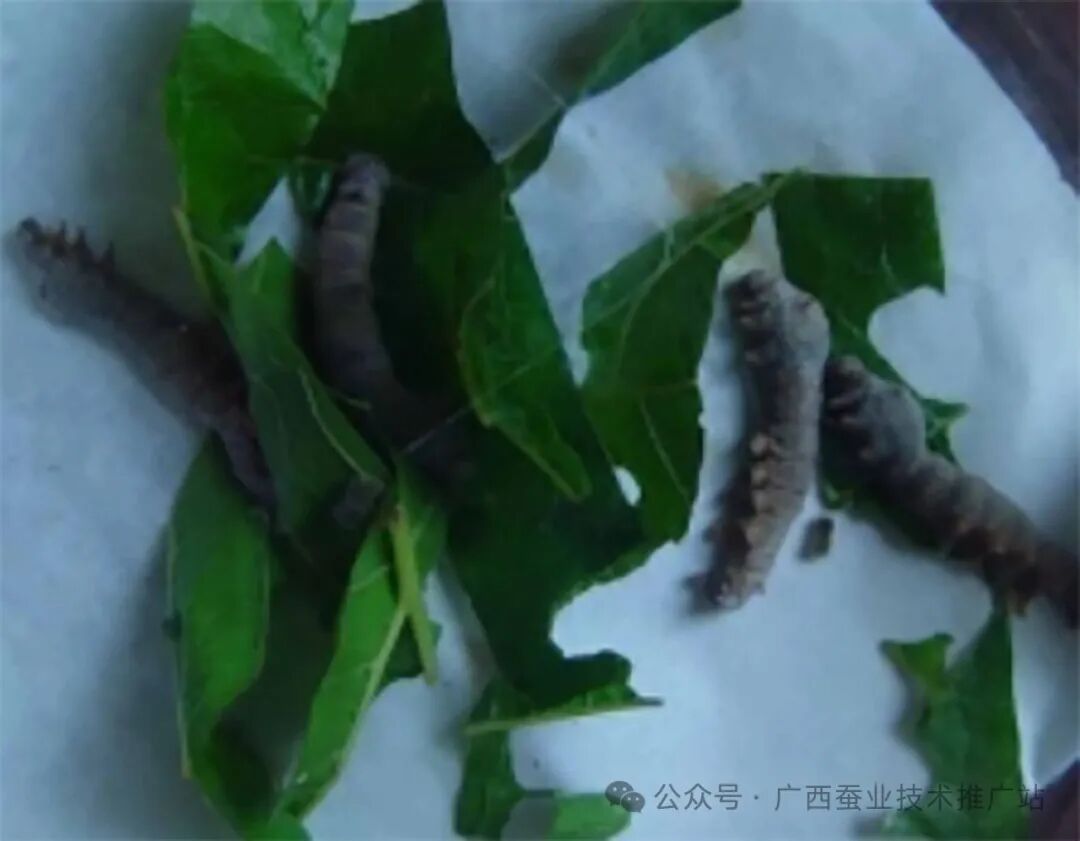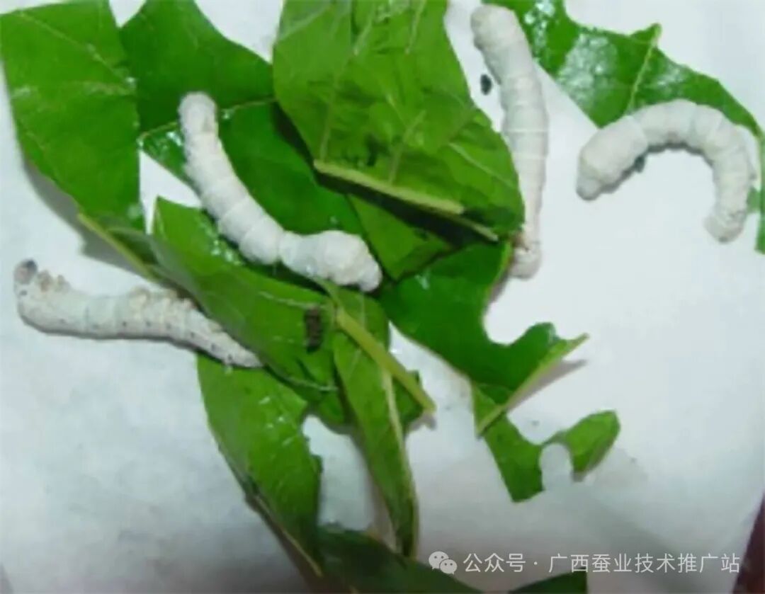 用水要注意清洁,湿叶贮藏或堆桑过久、过厚而造成细菌在叶面滋生。 桑叶要合理储存,避免发热发酵,发酵变质的桑叶既损失了利于蚕体的营养,反而又是适合细菌繁殖的营养基质,使细菌大量繁殖感染家蚕;很多蚕农采取喷水方式保持桑叶新鲜,但要控制用水量,掌握桑叶含水率,当饲喂家蚕时桑叶表面水份已经干爽为宜。 3、添食抗菌素。