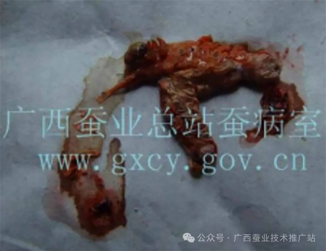 8.细菌性中毒病:家蚕感染病原突然停止食桑,胸部略膨胀,痉挛性颤动侧躺而死;有钩嘴状,腹部伸长,有轻微尸僵现象,最后全身发黑腐烂。(如下图)